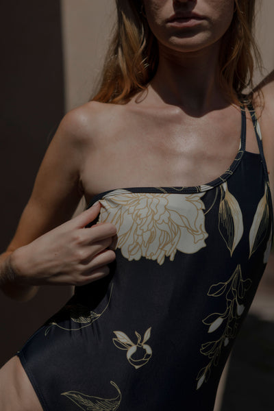The Sama One-Shoulder One-Piece embodies effortless modernity with its sculptural asymmetry. Cut from a smooth, body-skimming stretch fabric, this sleek silhouette contours gracefully while offering a refined, minimal aesthetic.